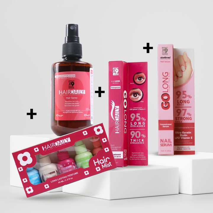 روتين التطويل من جولونج مع بوكس الهير ميست بـ 5 روائح روتين متكامل للعناية بجمالك الطبيعي من جو لونج و هير دايلي باندل بتجمع بين 4 منتجات علاجية وجمالية تمنحك نتائج واضحة وسريعةسيروم الأظافرلتقوية الأظافر وترطيبها بعمق ماسكرا جولونج العلاجية لتحفيز نمو الرموش وملء فراغات الحواجب، Spray Go Long لتطويل الشعر وزيادة كثافته بتركيبة طبية فعالة وآمنة، وHair Mist Hair Daily برائحة ثابتة حتى 12 ساعة وترطيب يحافظ على نعومة ولمعان شعرك روتين واحد بيجمعلك تطويل شعر وتطويل الأظافر وتكثيف الرموش وملئ الحواجب